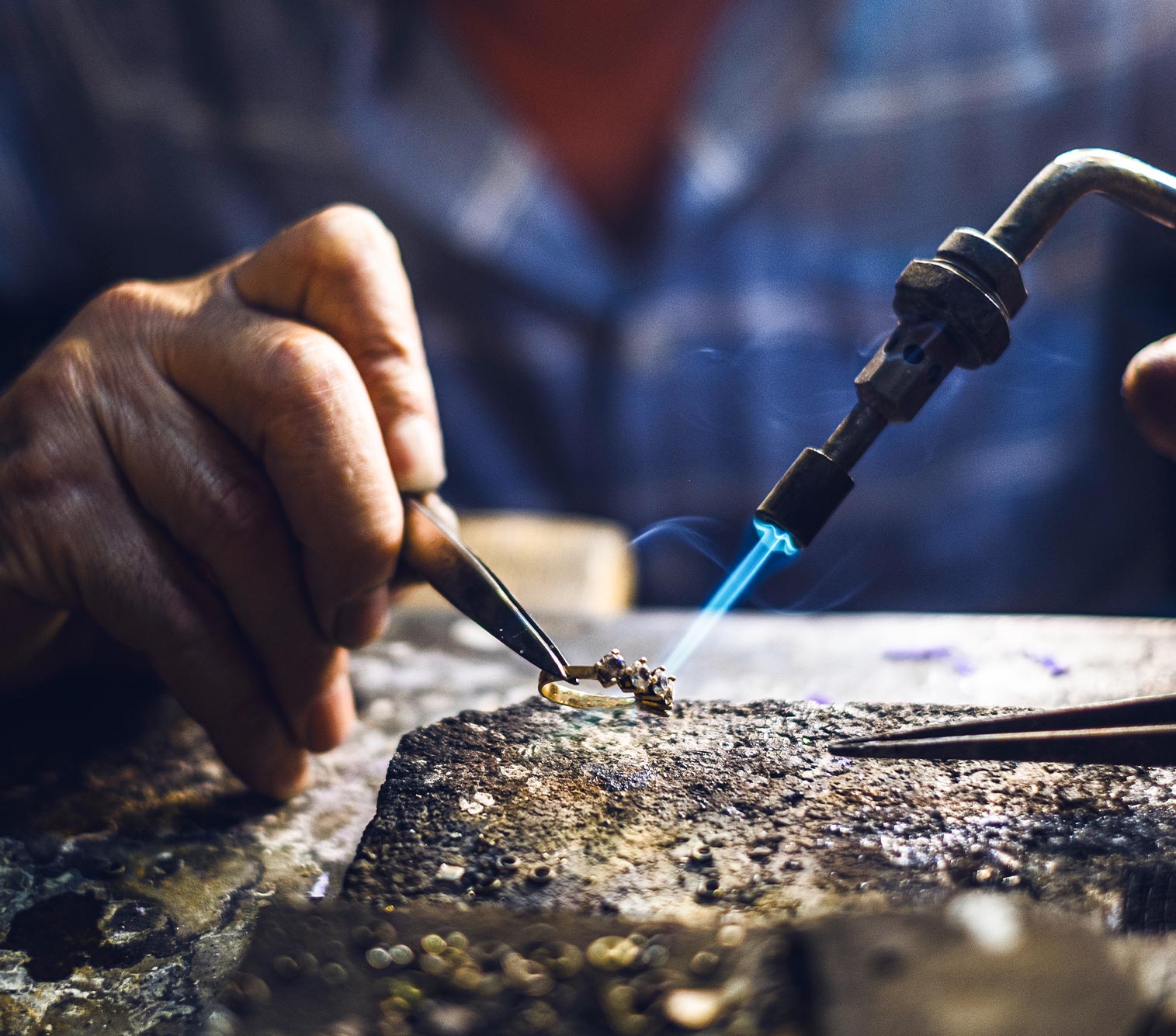 The wax model is placed in a casting flask which is then filled with investment solution ready to cure. This is then placed in a furnace which will burn away the wax and create a mould ready to be filled with the precious metal of your choice. When the metal has cooled, the rings are cleaned ready for the next step. Any separate components that are needed are meticulously worked by cutting the metal and soldering with a welding torch to get precision positioning.